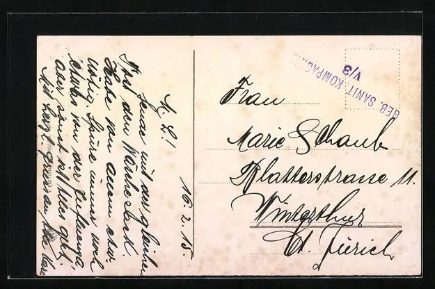 Personenbezogene Daten auf der Rückseite der Karte wurden durch blauen Textmarker unkenntlich gemacht. Die blauen Stellen sind auf die Vorderseite durchgeweicht und wirken sich negativ auf das Postkartenfoto aus