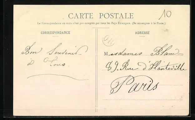 Personenbezogene Daten auf der Rückseite der Karte wurden durch blauen Textmarker unkenntlich gemacht. Die blauen Stellen sind auf die Vorderseite durchgeweicht und wirken sich negativ auf das Postkartenfoto aus