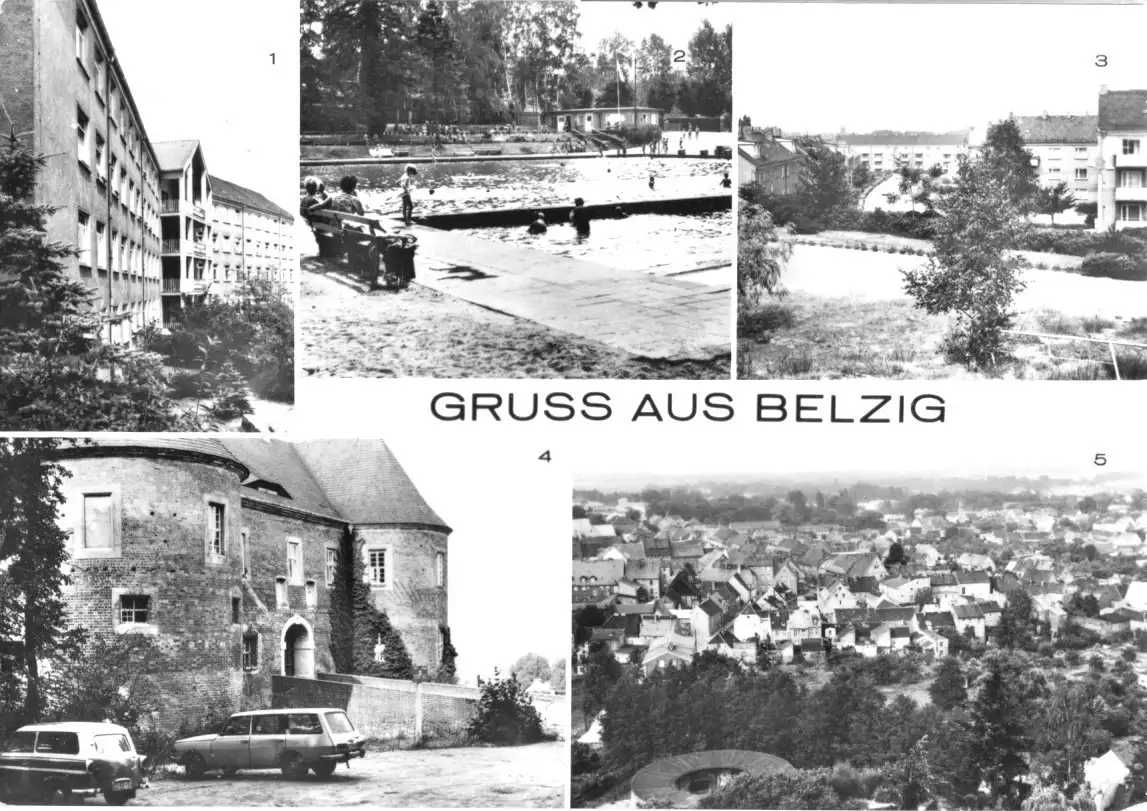 Ansichtskarte Belzig fünf Abb. - Kreiskrankenhaus, Schwimmbad, Schillerstr., Burg Eisenhardt, Teilansicht Erhaltung I-II ungelaufen Druckvermerk: 1982 Herstellungsland: DDR Verlag: Bild und Heimat Reichenbach - 01 04 01 057