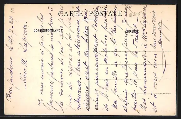 Personenbezogene Daten auf der Rückseite der Karte wurden durch blauen Textmarker unkenntlich gemacht. Die blauen Stellen sind auf die Vorderseite durchgeweicht und wirken sich negativ auf das Postkartenfoto aus