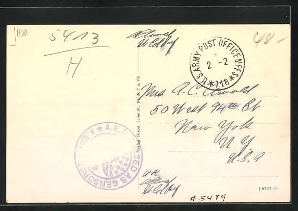 Personenbezogene Daten auf der Rückseite der Karte wurden durch blauen Textmarker unkenntlich gemacht. Die blauen Stellen sind auf die Vorderseite durchgeweicht und wirken sich negativ auf das Postkartenfoto aus