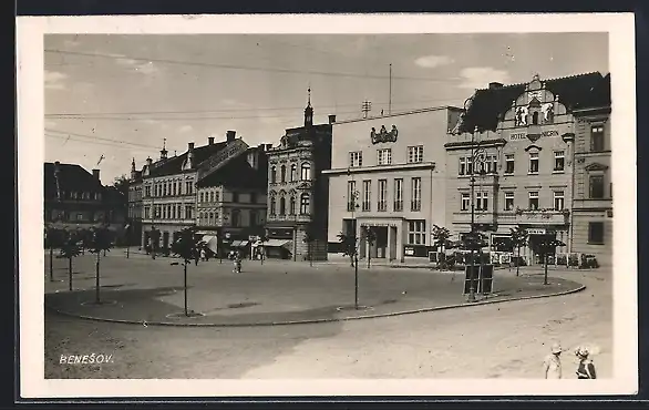 AK Beneschau / Benesov, Ortspartie mit Geschäften