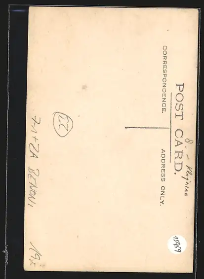 Personenbezogene Daten auf der Rückseite der Karte wurden durch blauen Textmarker unkenntlich gemacht. Die blauen Stellen sind auf die Vorderseite durchgeweicht und wirken sich negativ auf das Postkartenfoto aus