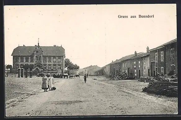 AK Bensdorf, Strassenpartie mit Anwohnern und Rinderherde