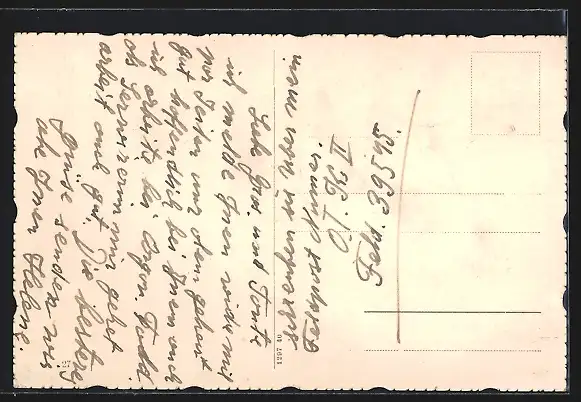 Personenbezogene Daten auf der Rückseite der Karte wurden durch blauen Textmarker unkenntlich gemacht. Die blauen Stellen sind auf die Vorderseite durchgeweicht und wirken sich negativ auf das Postkartenfoto aus