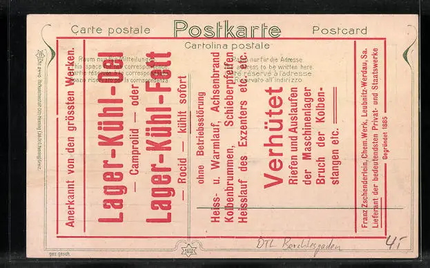 Personenbezogene Daten auf der Rückseite der Karte wurden durch blauen Textmarker unkenntlich gemacht. Die blauen Stellen sind auf die Vorderseite durchgeweicht und wirken sich negativ auf das Postkartenfoto aus