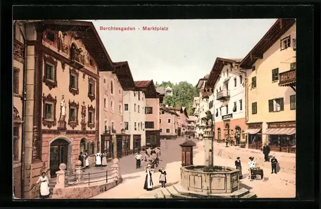 AK Berchtesgaden, Geschäfte und Brunnen auf dem Marktplatz