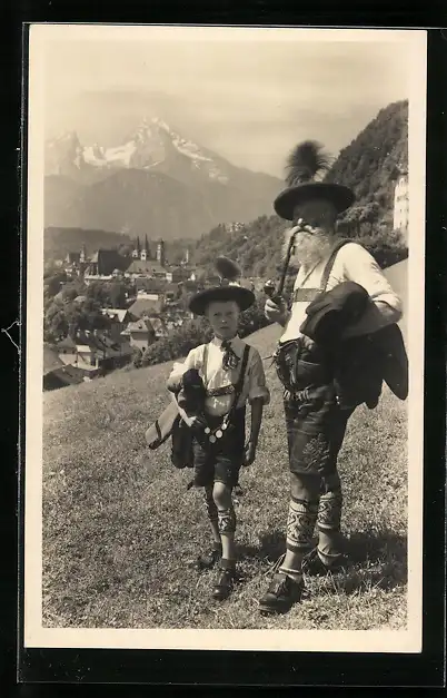 AK Berchtesgaden, Junge und Mann in Tracht, Ortsansicht