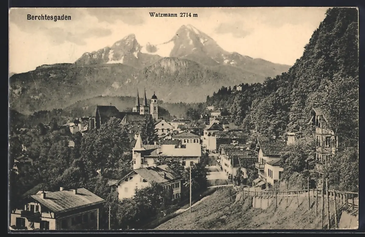 AK Berchtesgaden, Ortsansicht mit Kirche und Watzmann