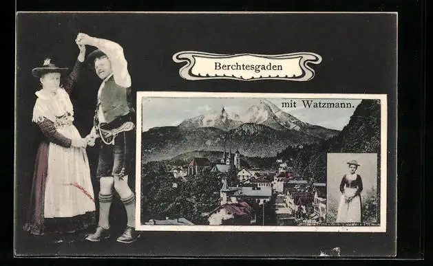 AK Berchtesgaden, Watzmann und Tänzer in Tracht