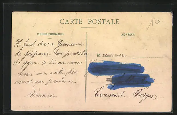 Personenbezogene Daten auf der Rückseite der Karte wurden durch blauen Textmarker unkenntlich gemacht. Die blauen Stellen sind auf die Vorderseite durchgeweicht und wirken sich negativ auf das Postkartenfoto aus