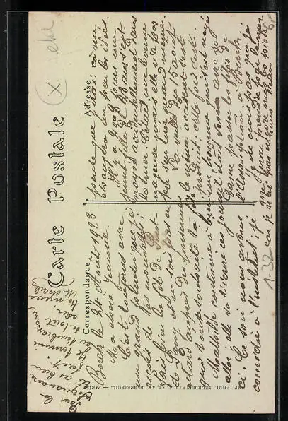 Personenbezogene Daten auf der Rückseite der Karte wurden durch blauen Textmarker unkenntlich gemacht. Die blauen Stellen sind auf die Vorderseite durchgeweicht und wirken sich negativ auf das Postkartenfoto aus