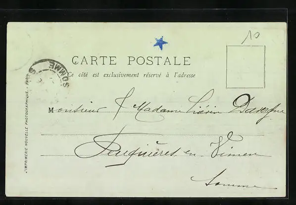Personenbezogene Daten auf der Rückseite der Karte wurden durch blauen Textmarker unkenntlich gemacht. Die blauen Stellen sind auf die Vorderseite durchgeweicht und wirken sich negativ auf das Postkartenfoto aus