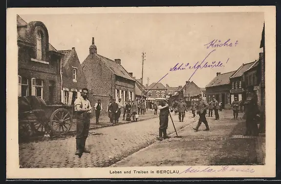 AK Berclau, belebte Strassenpartie mit Pferdefuhrwerk