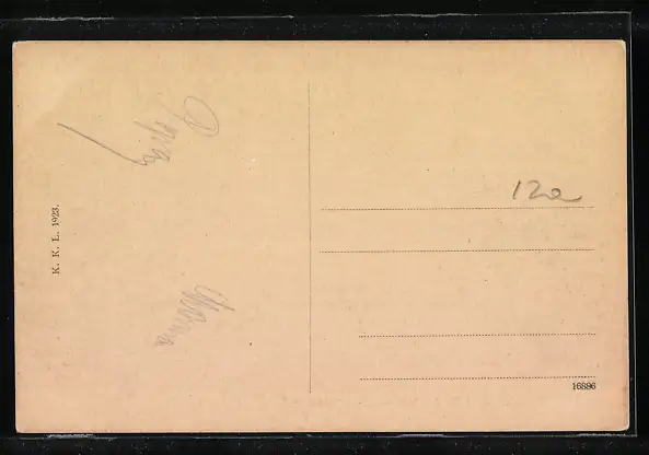 Personenbezogene Daten auf der Rückseite der Karte wurden durch blauen Textmarker unkenntlich gemacht. Die blauen Stellen sind auf die Vorderseite durchgeweicht und wirken sich negativ auf das Postkartenfoto aus