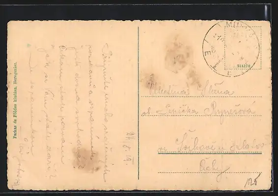 Personenbezogene Daten auf der Rückseite der Karte wurden durch blauen Textmarker unkenntlich gemacht. Die blauen Stellen sind auf die Vorderseite durchgeweicht und wirken sich negativ auf das Postkartenfoto aus