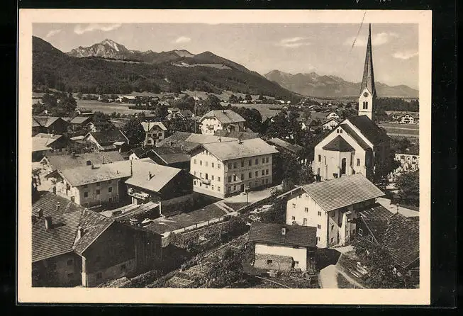AK Bergen, Ortsansicht mit Hochgern und Kampenwand