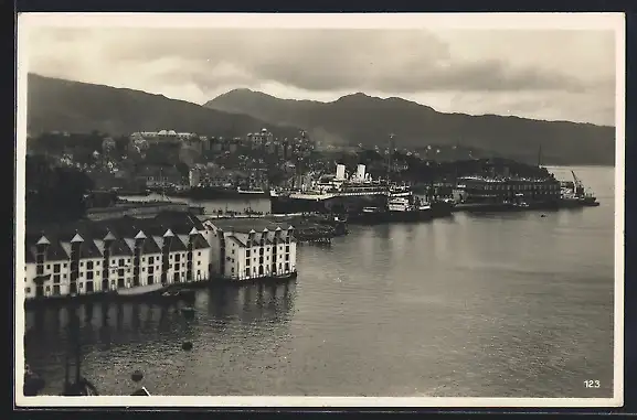 AK Bergen, Panorama über die Stadt mit Passagierschiff