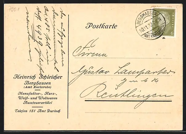 AK Berghausen /Amt Karlsruhe, Heinrich Schleicher Weisswarengeschäft