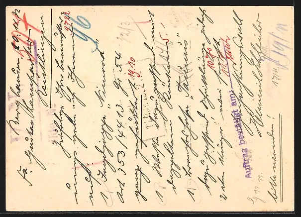 Personenbezogene Daten auf der Rückseite der Karte wurden durch blauen Textmarker unkenntlich gemacht. Die blauen Stellen sind auf die Vorderseite durchgeweicht und wirken sich negativ auf das Postkartenfoto aus
