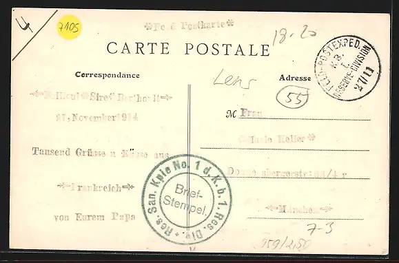 Personenbezogene Daten auf der Rückseite der Karte wurden durch blauen Textmarker unkenntlich gemacht. Die blauen Stellen sind auf die Vorderseite durchgeweicht und wirken sich negativ auf das Postkartenfoto aus