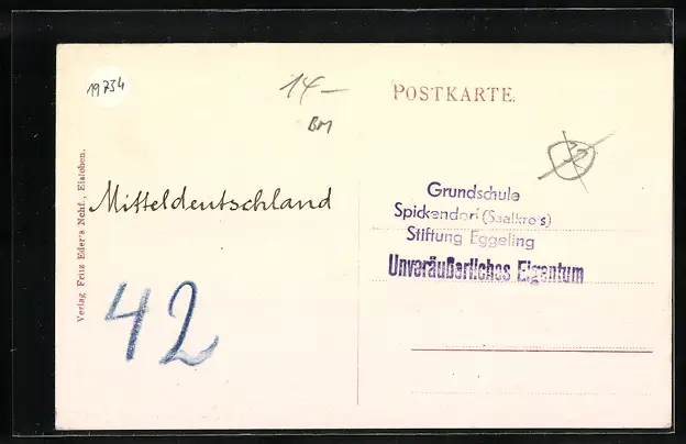 Personenbezogene Daten auf der Rückseite der Karte wurden durch blauen Textmarker unkenntlich gemacht. Die blauen Stellen sind auf die Vorderseite durchgeweicht und wirken sich negativ auf das Postkartenfoto aus