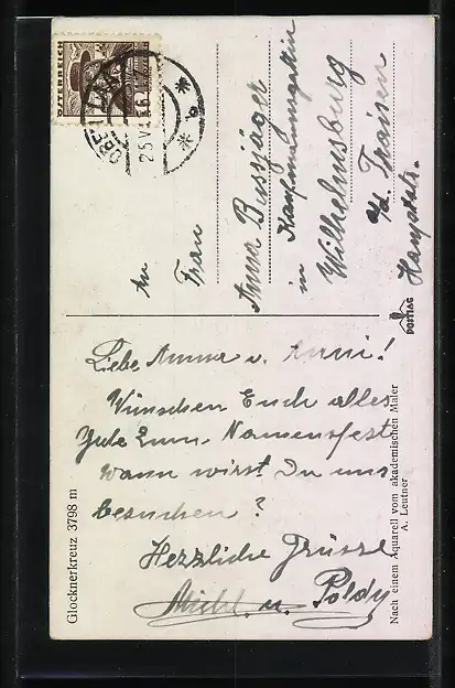 Personenbezogene Daten auf der Rückseite der Karte wurden durch blauen Textmarker unkenntlich gemacht. Die blauen Stellen sind auf die Vorderseite durchgeweicht und wirken sich negativ auf das Postkartenfoto aus