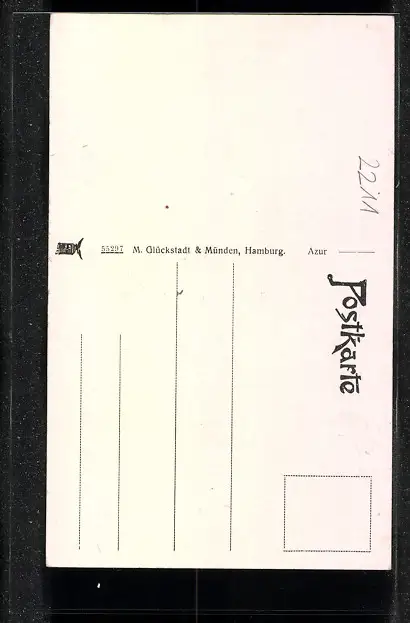 Personenbezogene Daten auf der Rückseite der Karte wurden durch blauen Textmarker unkenntlich gemacht. Die blauen Stellen sind auf die Vorderseite durchgeweicht und wirken sich negativ auf das Postkartenfoto aus