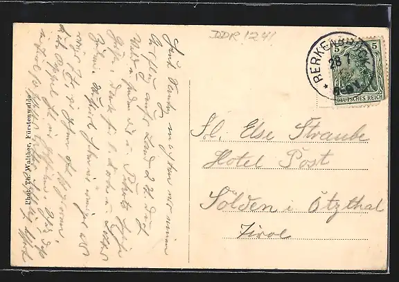 Personenbezogene Daten auf der Rückseite der Karte wurden durch blauen Textmarker unkenntlich gemacht. Die blauen Stellen sind auf die Vorderseite durchgeweicht und wirken sich negativ auf das Postkartenfoto aus