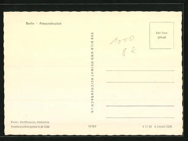 Personenbezogene Daten auf der Rückseite der Karte wurden durch blauen Textmarker unkenntlich gemacht. Die blauen Stellen sind auf die Vorderseite durchgeweicht und wirken sich negativ auf das Postkartenfoto aus