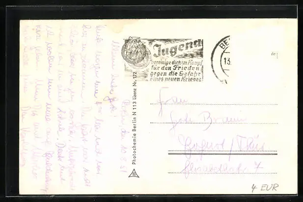alte Ansichtskarte, gelaufen 1951, Briefmarke entfernt, rückseitig Oberflächenschaden, Bugspur li. oben, guter Zustand