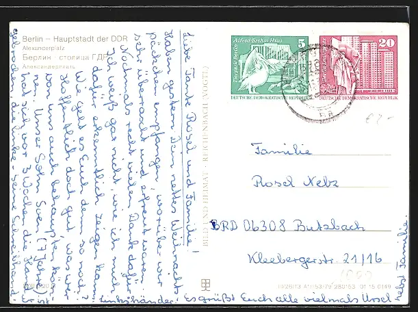 Personenbezogene Daten auf der Rückseite der Karte wurden durch blauen Textmarker unkenntlich gemacht. Die blauen Stellen sind auf die Vorderseite durchgeweicht und wirken sich negativ auf das Postkartenfoto aus