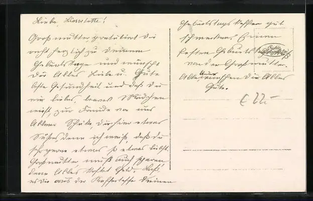Personenbezogene Daten auf der Rückseite der Karte wurden durch blauen Textmarker unkenntlich gemacht. Die blauen Stellen sind auf die Vorderseite durchgeweicht und wirken sich negativ auf das Postkartenfoto aus