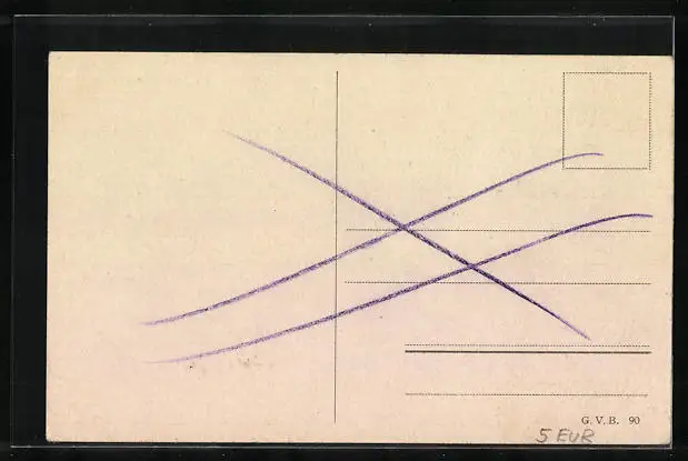Personenbezogene Daten auf der Rückseite der Karte wurden durch blauen Textmarker unkenntlich gemacht. Die blauen Stellen sind auf die Vorderseite durchgeweicht und wirken sich negativ auf das Postkartenfoto aus