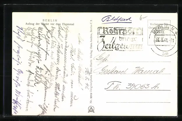 Personenbezogene Daten auf der Rückseite der Karte wurden durch blauen Textmarker unkenntlich gemacht. Die blauen Stellen sind auf die Vorderseite durchgeweicht und wirken sich negativ auf das Postkartenfoto aus