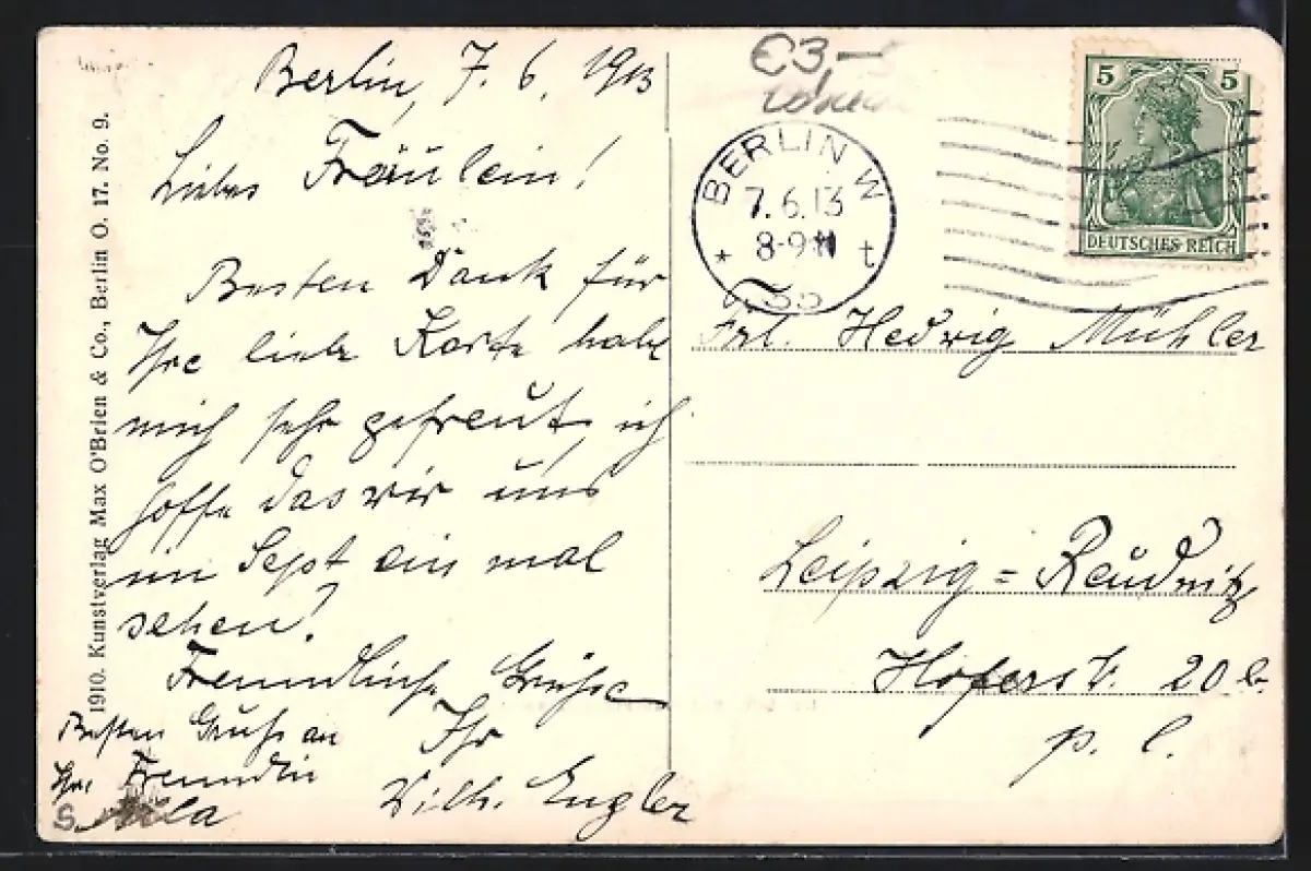 gelaufen 1913, Eckknicke li. oben u. re. unten, Ecken bestoßen, guter Zustand