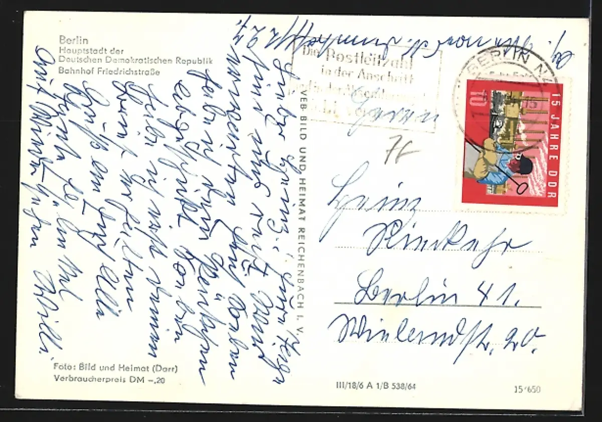 Personenbezogene Daten auf der Rückseite der Karte wurden durch blauen Textmarker unkenntlich gemacht. Die blauen Stellen sind auf die Vorderseite durchgeweicht und wirken sich negativ auf das Postkartenfoto aus