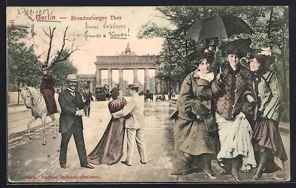 AK Berlin, Berliner Mädchen mit Schirm zeigen ihre Schuhe, Brandenburger Thor