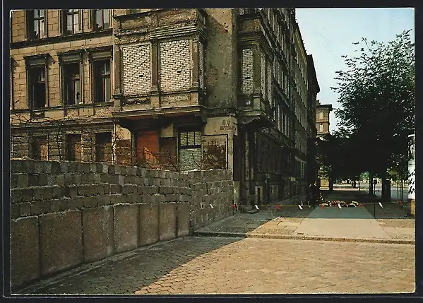 AK Berlin, Bernauer Strasse mit Berliner Mauer als Grenze