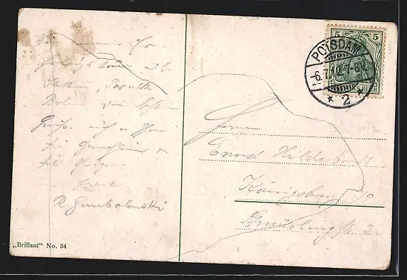 Personenbezogene Daten auf der Rückseite der Karte wurden durch blauen Textmarker unkenntlich gemacht. Die blauen Stellen sind auf die Vorderseite durchgeweicht und wirken sich negativ auf das Postkartenfoto aus