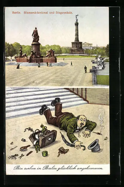 AK Berlin, Bismarckdenkmal und Siegessäule, Bin soeben in Berlin glücklich angekommen