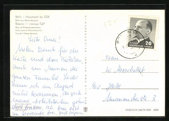 Personenbezogene Daten auf der Rückseite der Karte wurden durch blauen Textmarker unkenntlich gemacht. Die blauen Stellen sind auf die Vorderseite durchgeweicht und wirken sich negativ auf das Postkartenfoto aus