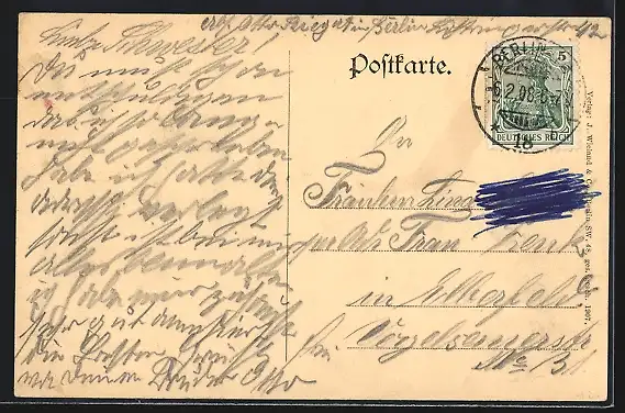 Personenbezogene Daten auf der Rückseite der Karte wurden durch blauen Textmarker unkenntlich gemacht. Die blauen Stellen sind auf die Vorderseite durchgeweicht und wirken sich negativ auf das Postkartenfoto aus