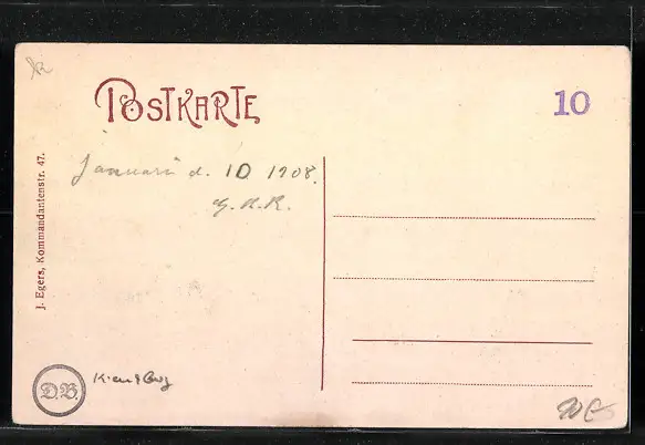 Personenbezogene Daten auf der Rückseite der Karte wurden durch blauen Textmarker unkenntlich gemacht. Die blauen Stellen sind auf die Vorderseite durchgeweicht und wirken sich negativ auf das Postkartenfoto aus