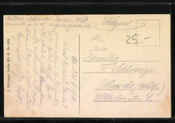 Personenbezogene Daten auf der Rückseite der Karte wurden durch blauen Textmarker unkenntlich gemacht. Die blauen Stellen sind auf die Vorderseite durchgeweicht und wirken sich negativ auf das Postkartenfoto aus