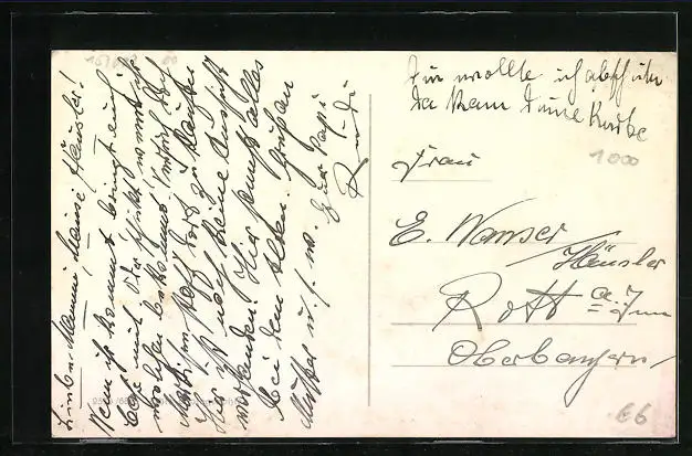 Personenbezogene Daten auf der Rückseite der Karte wurden durch blauen Textmarker unkenntlich gemacht. Die blauen Stellen sind auf die Vorderseite durchgeweicht und wirken sich negativ auf das Postkartenfoto aus