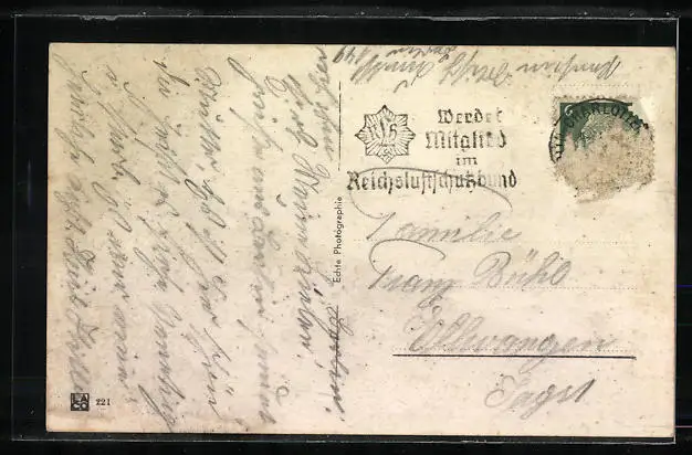 Personenbezogene Daten auf der Rückseite der Karte wurden durch blauen Textmarker unkenntlich gemacht. Die blauen Stellen sind auf die Vorderseite durchgeweicht und wirken sich negativ auf das Postkartenfoto aus