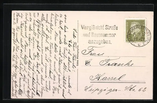 Personenbezogene Daten auf der Rückseite der Karte wurden durch blauen Textmarker unkenntlich gemacht. Die blauen Stellen sind auf die Vorderseite durchgeweicht und wirken sich negativ auf das Postkartenfoto aus