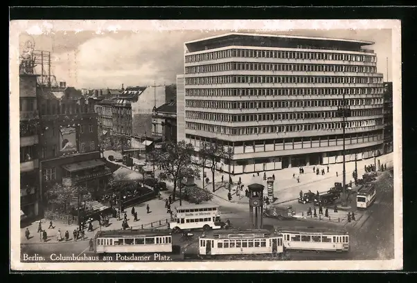 AK Berlin, Columbushaus am Potsdamer Platz und Strassenbahnen