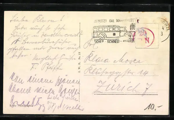 Personenbezogene Daten auf der Rückseite der Karte wurden durch blauen Textmarker unkenntlich gemacht. Die blauen Stellen sind auf die Vorderseite durchgeweicht und wirken sich negativ auf das Postkartenfoto aus